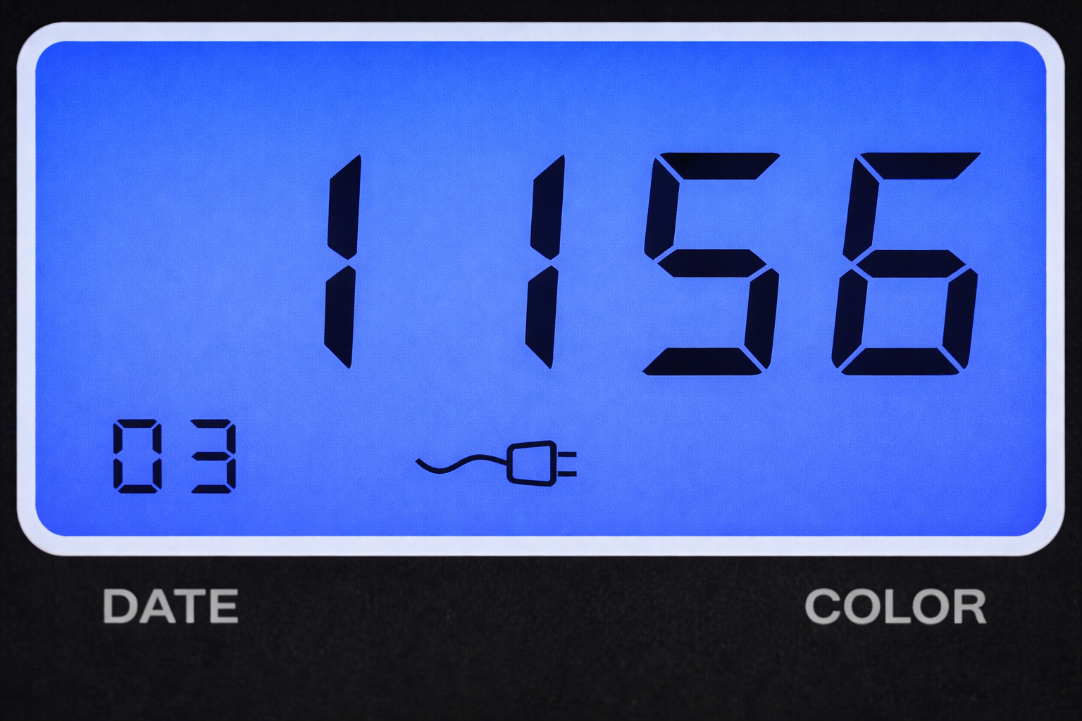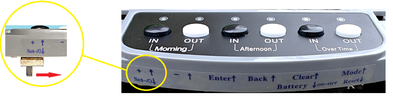 4, Looking at the button panel you will see a secondary function for each of the buttons. If the year is correct then press the Enter (Afternoon IN) button, otherwise use the + (Morning IN) or - (Morning OUT) buttons to adjust before pressing the Enter button.