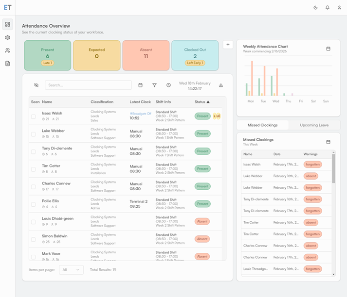 This section shows how many employees are Present, Expected, Absent, or Clocked Out. Each status is colour-coded so you can quickly identify any issues. Employees who are absent are clearly highlighted.