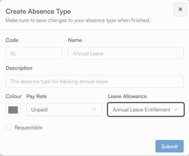 Additionally there is also a requestable field. This is if you would like this absence to be requestable by employees within the Employee Portal. Selecting a colour will highlight this absence as specified when booked.