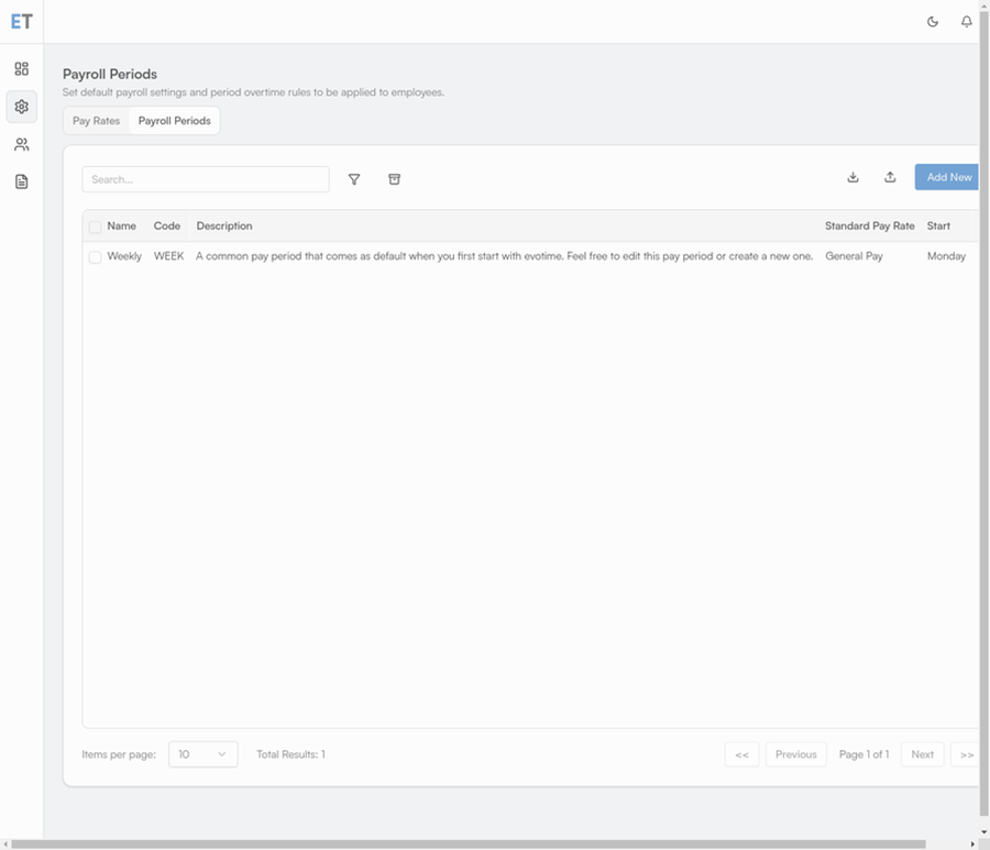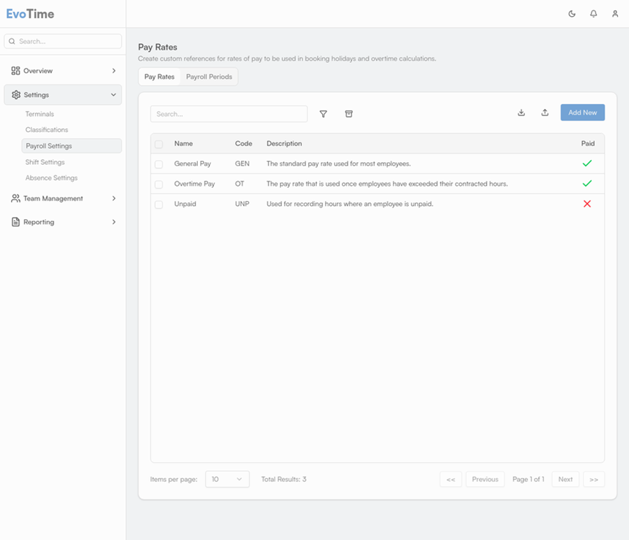EvoTime Pro allows you to configure payroll settings so that employee hours and pay-related data are organised correctly for payroll processing. This includes creating pay rates, such as standard and overtime, and defining payroll periods to match your pay schedule. This guide explains how to set up payroll settings within EvoTime Pro.