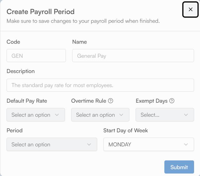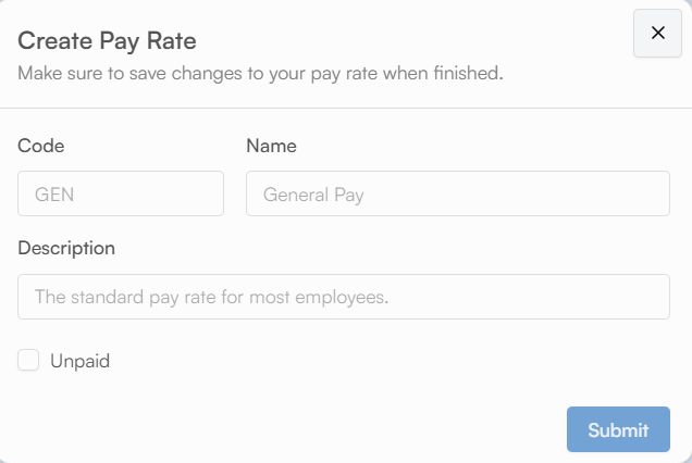 Enter the details for the pay rate (for example, “Standard Rate” or “Overtime”), then click Submit.